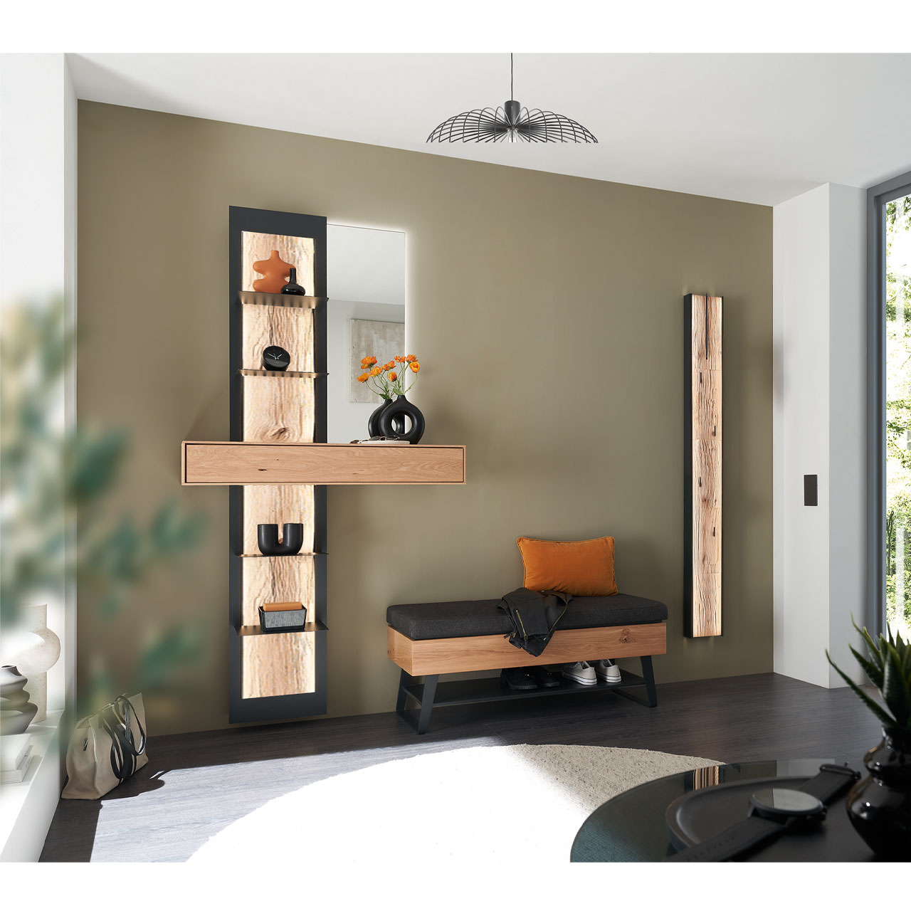 Garderobe SALVO - Spiegelpaneel mit Ablageböden und echter Rinde rechteckiger Spiegel Rinden-Applikation rechts, eingefasst in Metallrahmen anthrazit 1 Metallablageboden anthrazit 1 Holzablageboden Maße in cm: B 117,5 / H 79 / T 22 Optional gegen Aufpreis erhältlich: Paneel-Beleuchtung (Nr. 8550G-9761) Wichtige Informationen: Bei Hängeelementen muss die Wand tragfähig sein. Standelemente müssen gegen das Kippen nach vorne gesichert werden.Weitere Hinweise finden Sie in der dazugehörigen Montageanleitung unter "Verfügbare Downloads"!Farben können auf verschiedenen Bildschirmen abweichen. Deko oder andere Beimöbel sind nicht enthalten. Abbildung kann abweichen.